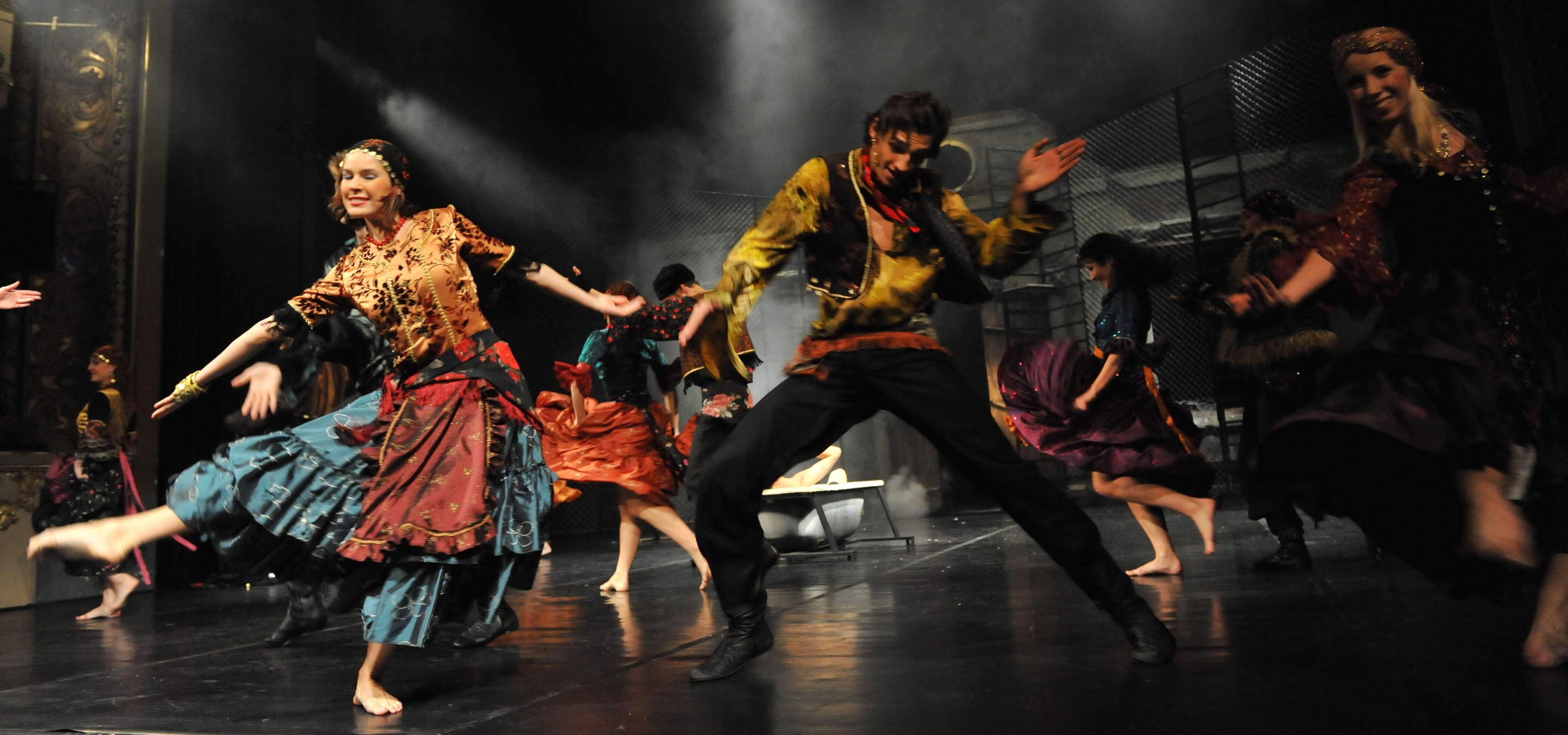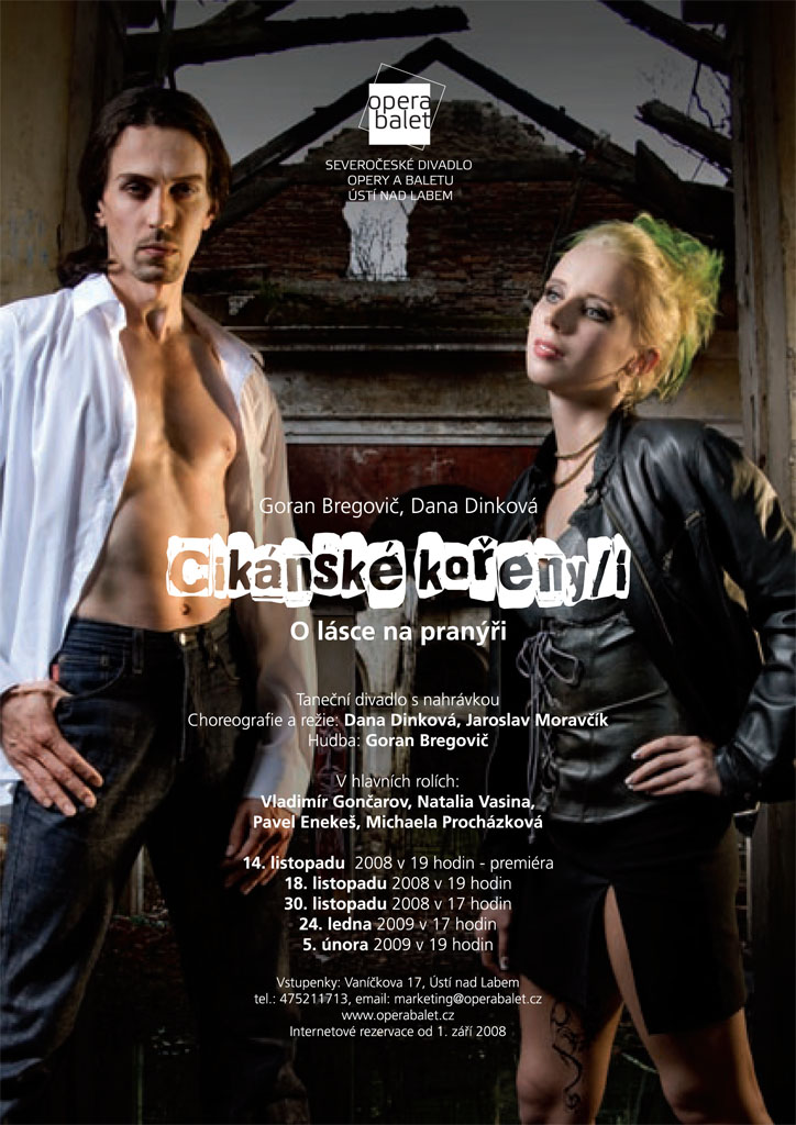 Příběh s rozměrem shakespearovské tragédie o lásce bílé dívky a romského chlapce je koncipován jako moderní taneční divadlo s temperamentní hudbou balkánského skladatele Gorana Bregoviče. Jejich láska naráží na bariéry vztyčené rozdílností kultur, ze kterých vzešli, a na skryté či otevřené animozity mezi dvěma odlišnými sociálními prostředími. Cikánské kořeny/í jsou vystavěny na dynamických sborových akcích: přinášejí jiskru, živelnost a nápaditost. Choreografie je prodchnuta stylizovanými folklorními prvky; rytmický doprovod mnohdy vytvářejí tanečníci sami hrou na nejbizarnější nástroje a předměty. Přirozenost tanečního projevu a výrazná pohybová zkratka, s níž tvůrci vyprávějí příběh, jsou hybnou silou inscenace, která se těší velké oblibě již od roku 2001, kdy byla poprvé uvedena na Slovensku. V titulní roli vystupuje Vladimir Gončarov, který byl za roli Čobana oceněn prestižní cenou Thálie 2008. Inscenace má na svém kontě i další vavříny: Severočeské divadlo získalo na Soutěžní přehlídce současné taneční tvorby v minulém roce Cenu za nejlepší kolektivní výkon právě za inscenaci Cikánské kořeny/í. Vladimír Gončarov navíc v téže soutěži získal Cenu za nejlepší sólový výkon a to opět za roli Čobana.