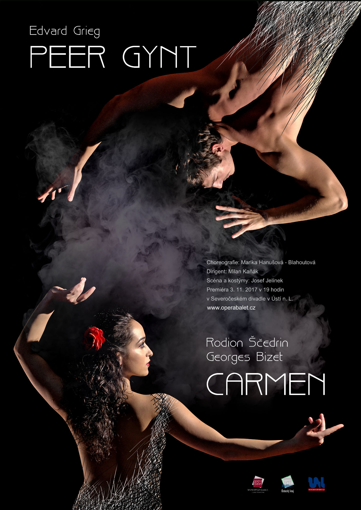 OSOBY A OBSAZENÍ:PG - Peer Gynt: Róbert Király / Roberts SkujenieksPG - Solveig (dívka a strážný anděl): Annamaria Voltolini / Emmeline JansenPG - Ase (matka): Elena Mazanova / Frederika KvačákováPG - Ingrid (nevěsta): Olivia LenssensPG - Ženich: Salvador Sasot SellartPG - Anitra: Zuzana Novoborská / Blanka TasiPG - Knoflíkář, Smrt: Vladimir GončarovPG - Král trolů: Pavel Enekeš / Francesco CalipariPG - Dcera krále trolů: Eliška ČernohlávkováPG - sbor ženy: Sabína Babišová / Linda Buňková / Eliška Černohlávková / Kateřina Kapitánová / Frederika Kvačáková / Olivia Lenssens / Mizuho Nagata / Blanka Tasi / Zuzana NovoborskáPG - sbor muži: Lorenzo Colella / Salvador Sasot Sellart / Roberts Skujenieks / Francesco Calipari / Roman Soviar / Pavel EnekešCA - Carmen: Frederika KvačákováCA - José: Róbert KirályCA - Escamilio: Roberts SkujenieksCA - Manžel: Vladimir GončarovCA - Věštkyně: Elena MazanovaCA - sbor ženy: Sabína Babišová / Linda Buňková / Eliška Černohlávková / Emmeline Jansen / Kateřina Kapitánová / Olivia Lenssens / Mizuho Nagata / Zuzana Novoborská / Blanka Tasi / Annamaria VoltoliniCA - sbor muži: Lorenzo Colella / Salvador Sasot Sellart / Roman Soviar / Pavel Enekeš / Francesco Calipari