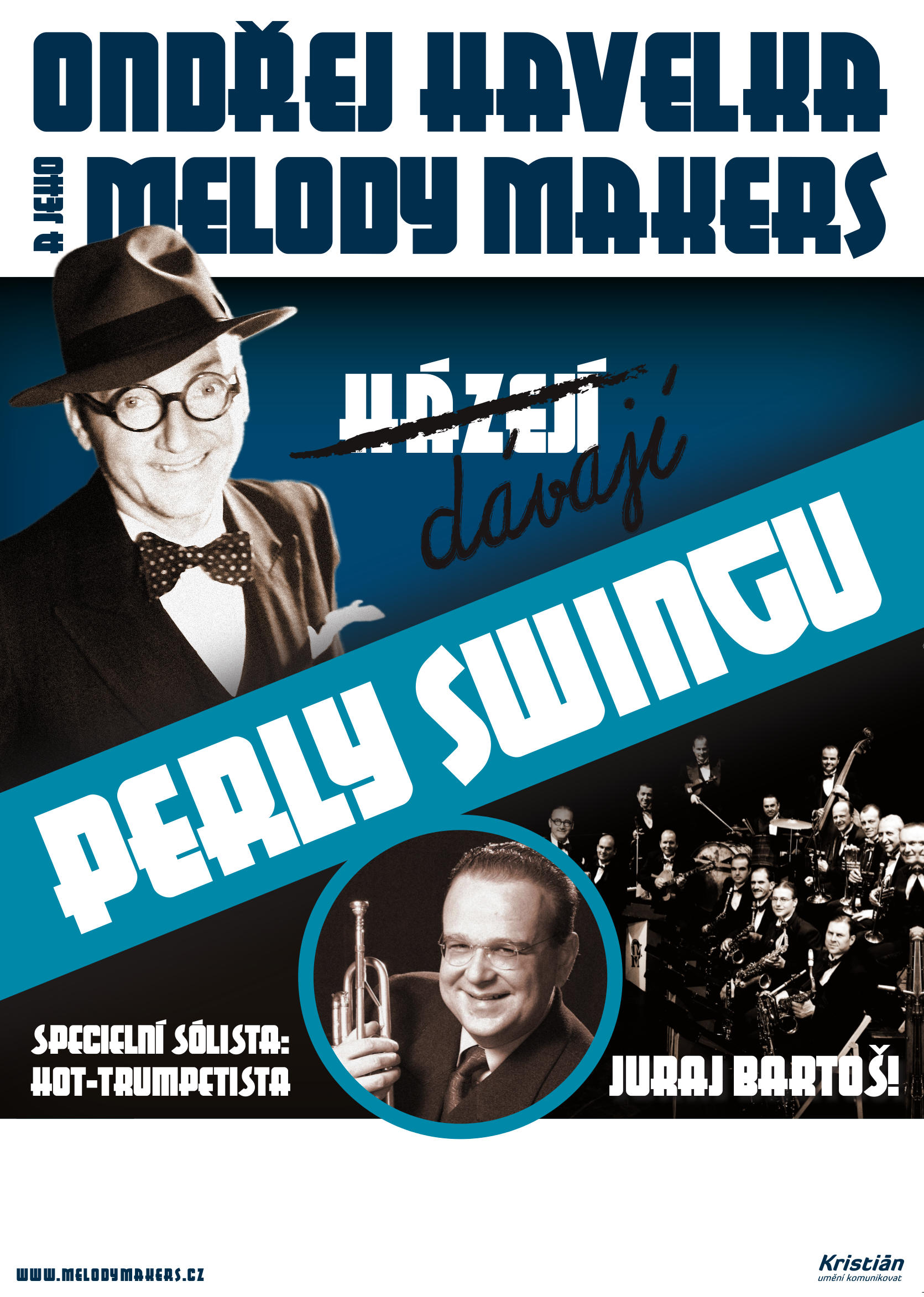 | Ondřej Havelka a jeho Melody Makers se tentokrát rozhodli nabídnout Ti ty vůbec nejkrasší hudební perly, jež nám světový swing 30. a 40. let zanechal. Zběsilé, virtuózní kusy střídají nesmrtelné sladké melodie. Žhavý americký swing zvedá ze židlí, české písně konejší Tvé nervy. Anebo naopak! Beze všech pochyb však věz, že hned po prvních vteřinách strhující show plné rytmu a humoru, korunované brilantními výkony famózního evropského hot-trumpetisty Juraje Bartoše, Ti zazáří... „Plaménky v očích Tvých...“! více o tomto představení... | |||||||