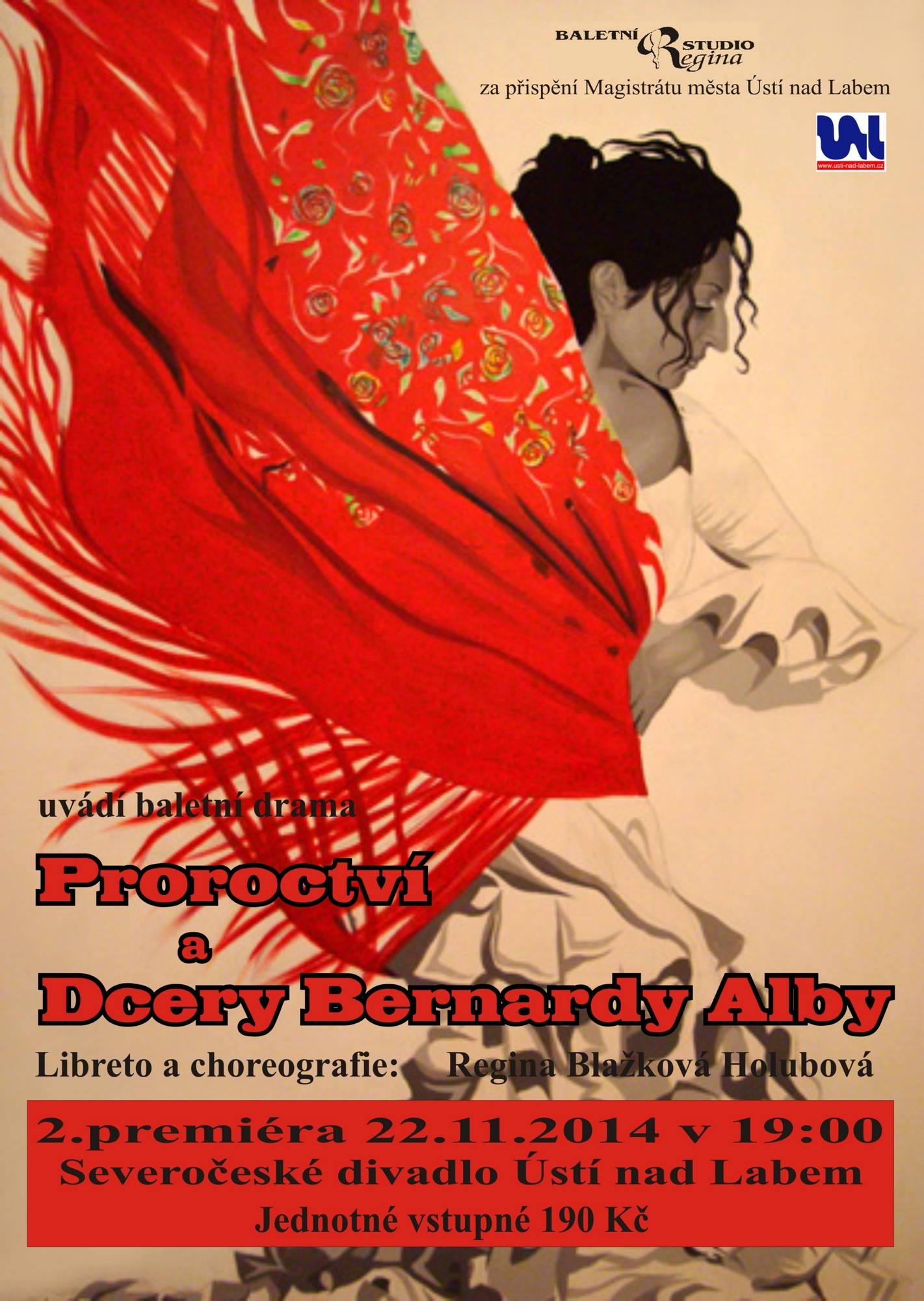 pořadatel Baletní studio Regina Ústí nad Labem Tyto balety patří mezi nejúspěšnější v repertoáru Baletního studia Regina. Uvidíte vynikající taneční i herecké výkony našich sólistů i souboru.“Proroctví” je taneční obrázek inspirovaný předpovědí o světové apokalypse. Svým obsahem ukazuje pocity lidí po katastrofě. Titulní postavy reprezentují soucit, lásku, naději a víru, které dovedou lidstvo k lepší budoucnosti více spjaté s přírodou. “Dcery Bernardy Alby” je baletní drama inspirované dílem Féderica Garcíi Lorci Dům Bernardy Albové. Děj se odehrává ve starém Španělsku, v rodině ovládané despotickou matkou. Balet zřetelně ukazuje charaktery postav a vztahy mezi nimi. více o tomto představení... | |||||||