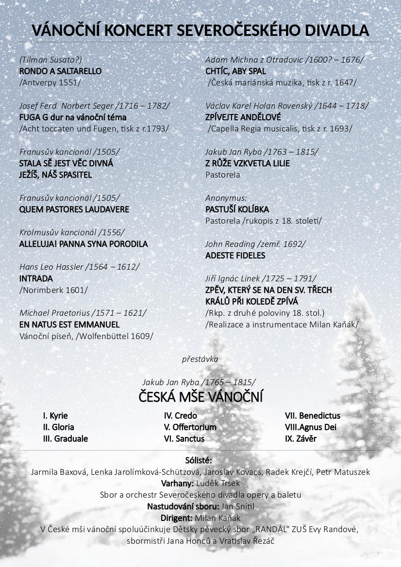 | Sólisté: Jarmila Baxová, Lenka Jarolímková-Schützová, Jaroslav Kovacs, Radek Krejčí, Petr Matuszek Varhany – Luděk Trsek Sbor a orchestr Severočeského divadla opery a baletu Nastudování sboru Jan Snítil Dirigent Milan Kaňák V České mši vánoční spoluúčinkuje Dětský pěvecký sbor „RANDÁL“ ZUŠ Evy Randové, sbormistři Jana Honců a Vratislav Řezáč | |||||||||