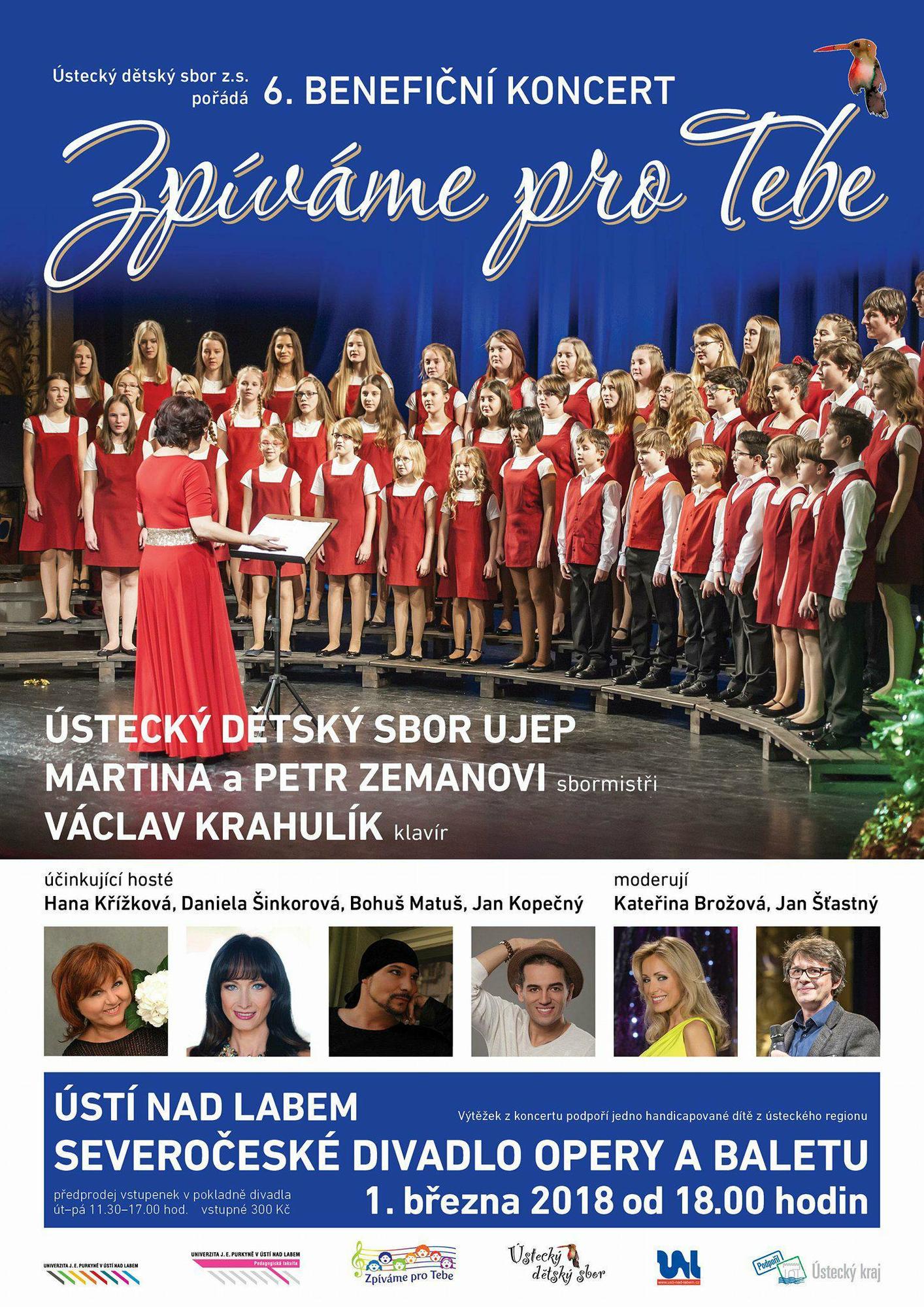 Ústecký dětský sbor z.s.Ústí nad Labem ÚSTECKÝ DĚTSKÝ SBOR UJEPMARTINA a PETR ZEMANOVI sbormistři VÁCLAV KRAHULÍK klavír účinkující hosté: Hana Křížková, Daniela Šinkorová, Bohuš Matuš, Jan Kopečný moderují: Kateřina Brožová, Jan Šťastný Výtěžek z koncertu podpoří jedno handicapované dítě z ústeckého regionu | |||||||