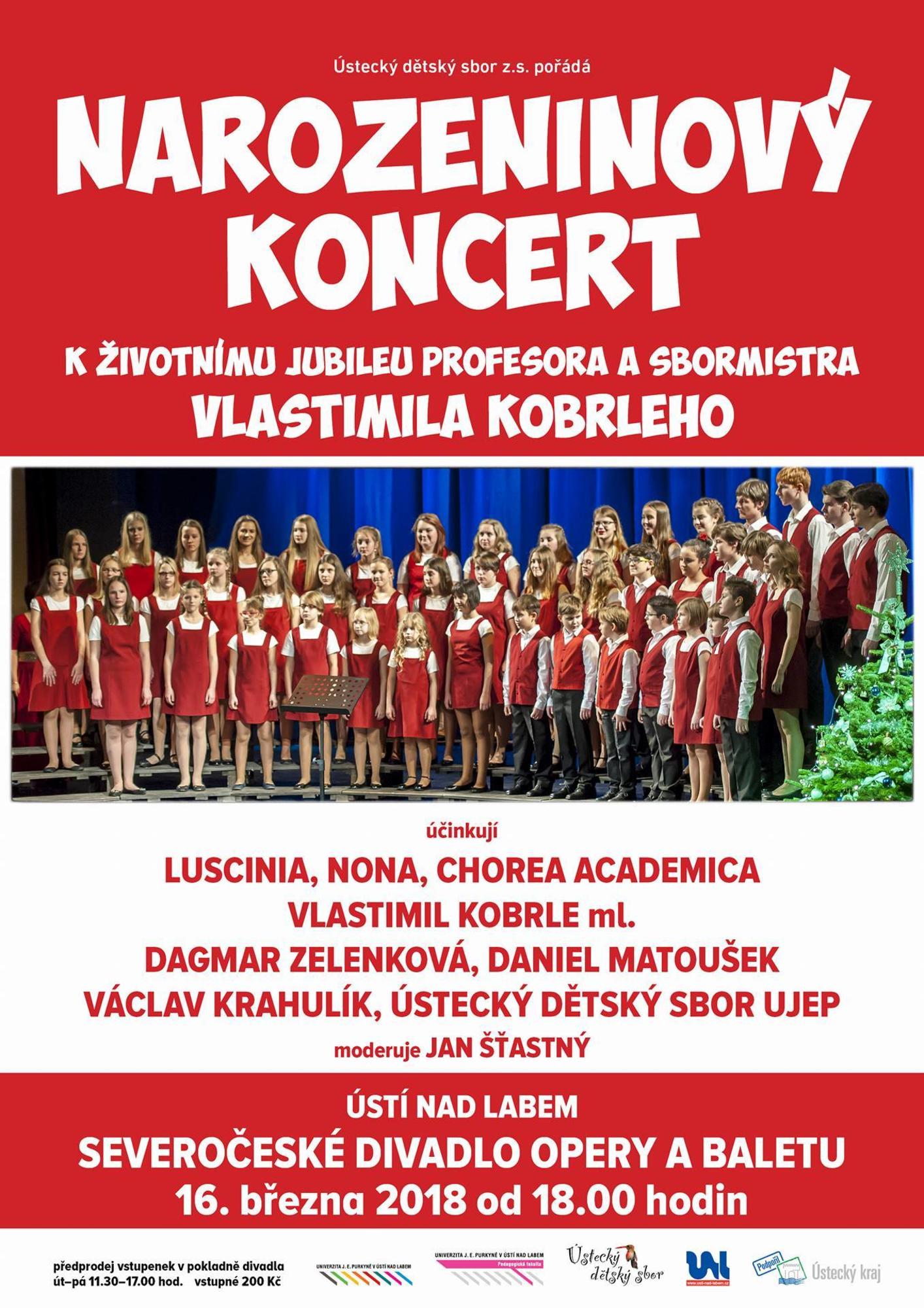 Ústecký dětský sbor z.s.Ústí nad Labem K ŽIVOTNÍMU JUBILEU PROFESORA A SBORMISTRA VLASTIMILA KOBRLEHOúčinkují: LUSCINIA, NONA, CHOREA ACADEMICA, VLASTIMIL KOBRLE ml, DAGMAR ZELENKOVÁ, DANIEL MATOUŠEK, VÁCLAV KRAHULÍK, ÚSTECKÝ DĚTSKÝ SBOR UJEP moderuje JAN ŠŤASTNÝ | |||||||