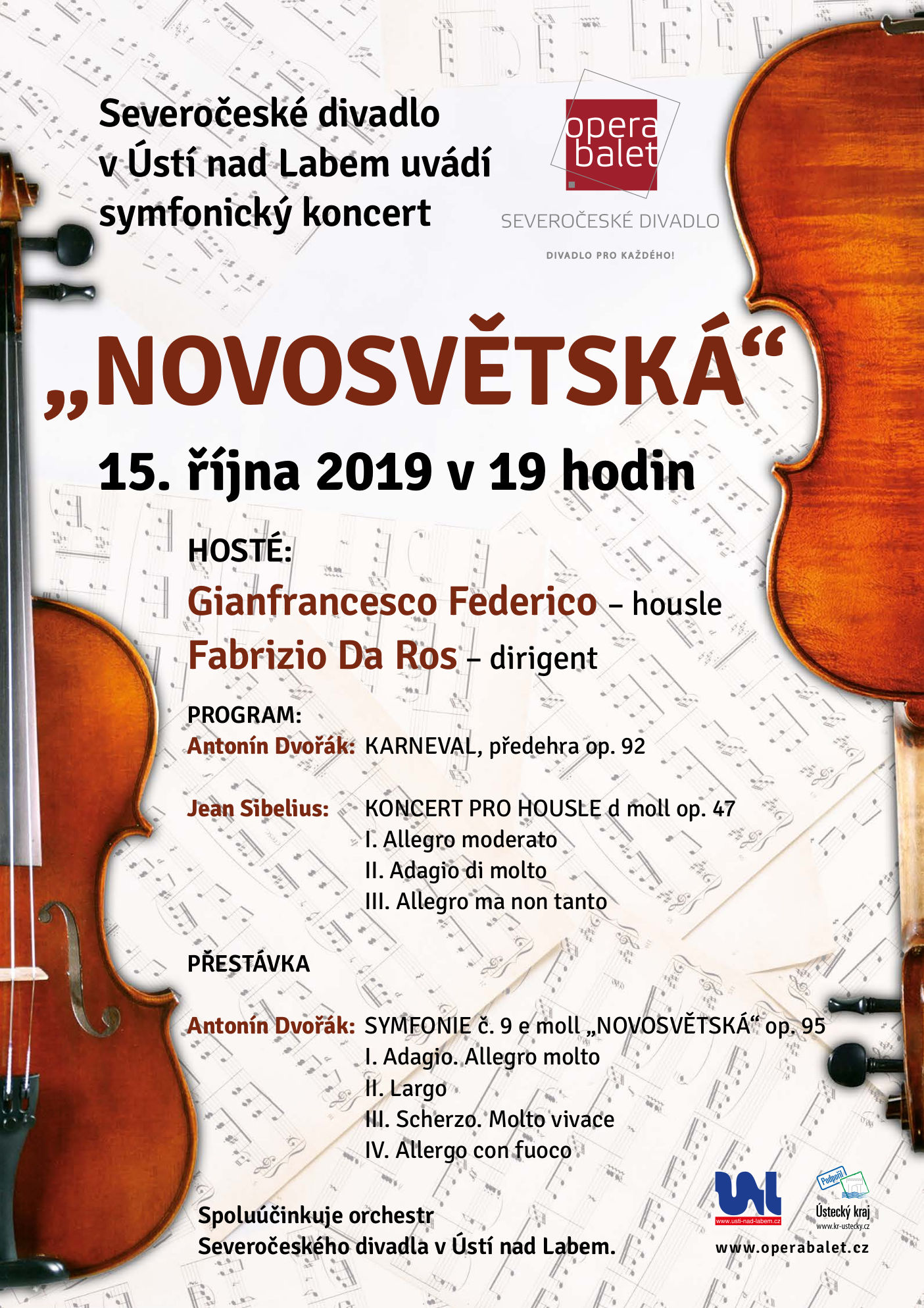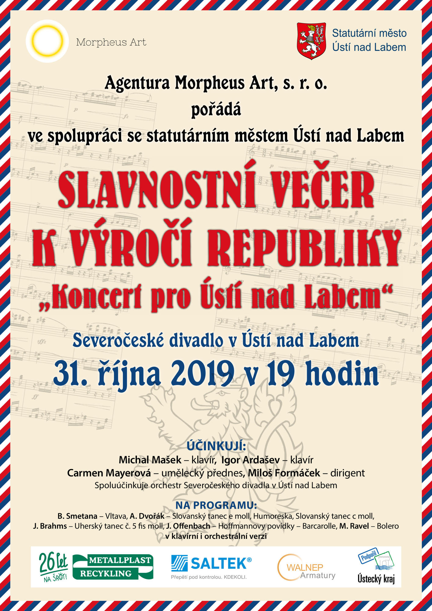 "KONCERT PRO ÚSTÍ NAD LABEM"ÚČINKUJÍ: Michal Mašek – klavír, Igor Ardašev – klavír Carmen Mayerová – umělecký přednes, Miloš Formáček – dirigent Spoluúčinkuje orchestr Severočeského divadla v Ústí nad Labem NA PROGRAMU: B. Smetana – Vltava, A. Dvořák – Slovanský tanec e moll, Humoreska, Slovanský tanec c moll, J. Brahms – Uherský tanec č. 5 fis moll, J. Offenbach – Hoffmannovy povídky – Barcarolle, M. Ravel – Bolero v klavírní i orchestrální verzi | |||||||
