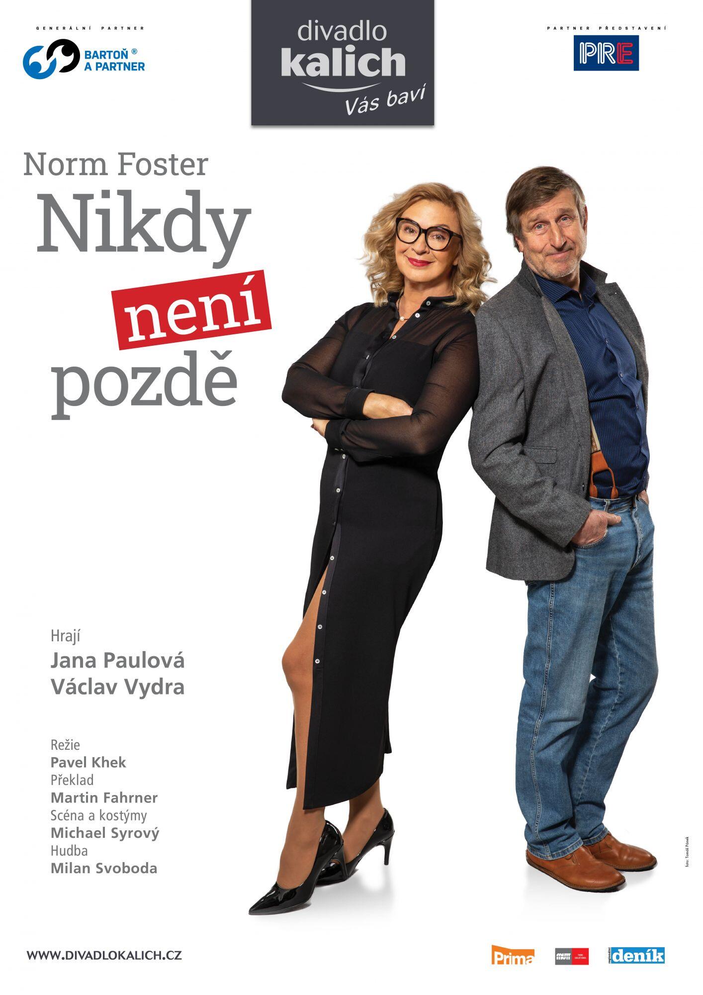 Divadlo Kalich Jana Paulová a Václav Vydra jako filmová dvojice trhají divácké rekordy, kdykoli se objeví na obrazovce, ovšem na divadelním jevišti se spolu setkávají až nyní. Dlouho totiž hledali natolik dobrý komediální text, který by byl pro tak výjimečnou spolupráci dostatečným důvodem. Takový text našli v důmyslně vystavěné komedii Norma Fostera Nikdy není pozdě. Dává vyniknout ohromnému komediálnímu talentu obou herců, zároveň má i ztišené tóny k zamyšlení. Vypráví příběh dvou lidí, jejichž životní cesty se v průběhu dlouhých desetiletí sice několikrát protnou, ale pokaždé se zase vydají jiným směrem. Až dojde k jednomu osudovému setkání… Jana Paulová a Václav Vydra se v tomto příběhu objeví dohromady v šesti rolích! | |||||||